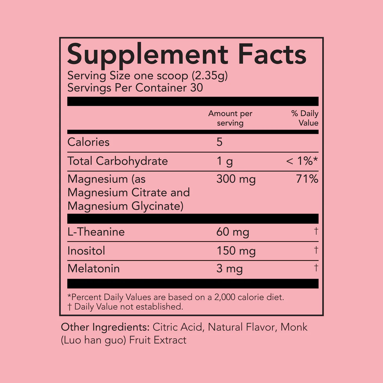 Magnesium (as Magnesium Citrate and Magnesium Bis-Glycinate), L-Theanine, Inositol, Melatonin, Citric Acid, Natural Hibiscus Flavor, Monk (Lou han guo) Fruit Extract.