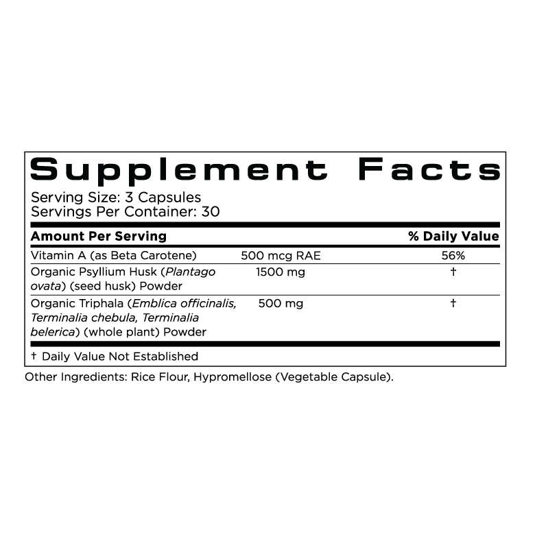 Vitamin A (as Beta Carotene), Organic Psyllium Husk (Plantago ovata) (seed husk) Powder, Organic Triphala (Emblica officinalis, Terminalia chebula, Terminalia belerica) (whole plant) Powder, Rice Flour, Hypromellose (Vegetable Capsule)